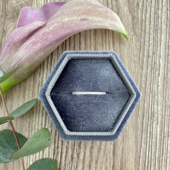 With 50% diamond coverage, this ring is a captivating statement of your love story. The delicate 1.6mm band is the perfect partner to your engagement ring, complementing both the look and the symbol of love.